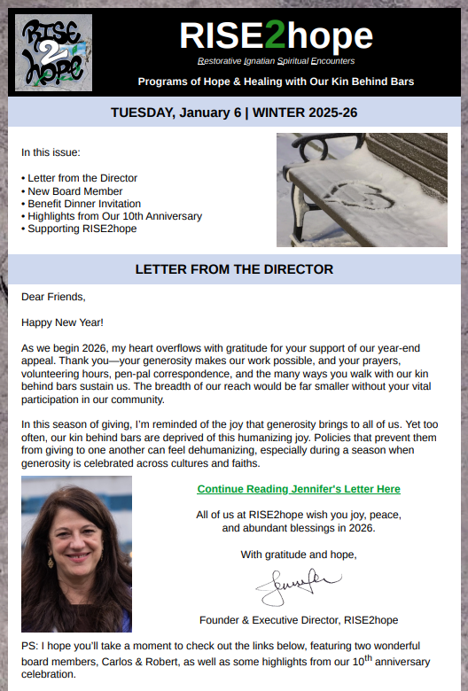 RISE2hope was born out of a concert. In 2015, Jennifer’s band played what was meant to be a one-time concert at Monroe Correctional Complex. During set-up, Jennifer got to chatting with three incarcerated men — Bill, Mark and Dylan — helping to set up amplifiers and microphones. She mentioned her previous experience with Ignatian retreats. Suddenly, Bill lit up: “An Ignatian retreat? I’ve been praying for one for years!” Jennifer knew she had to do something.